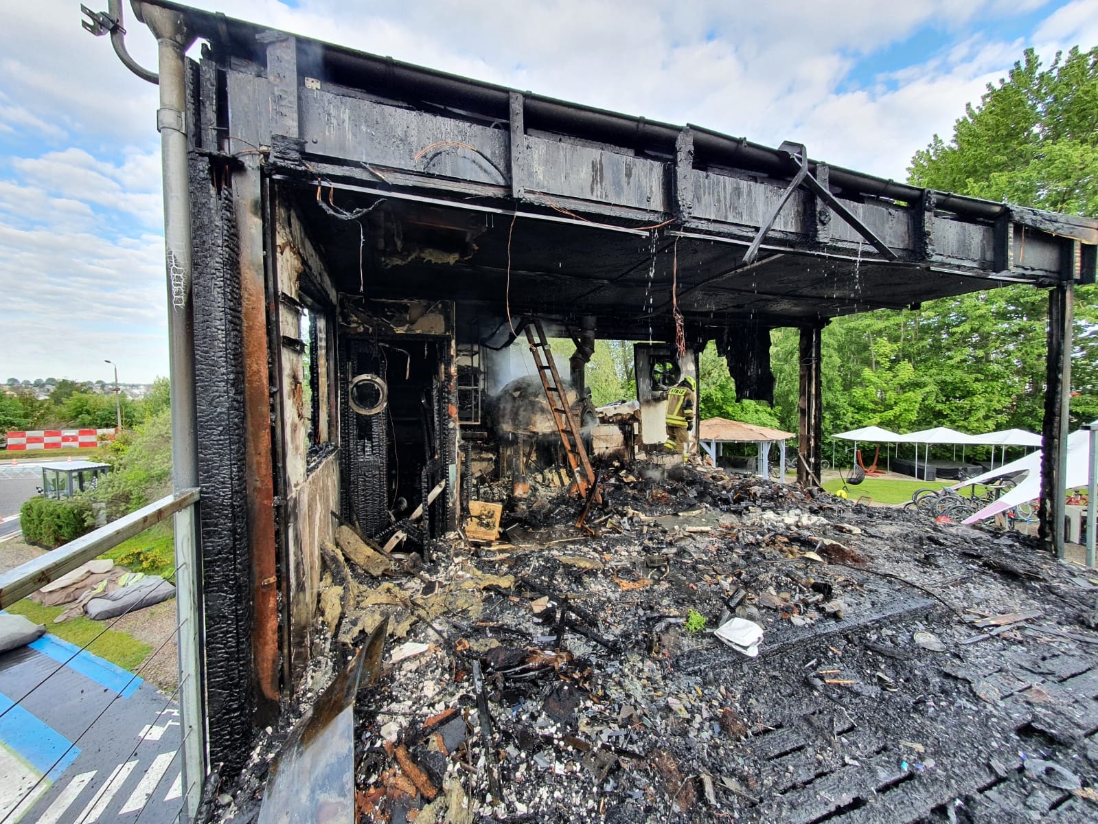 Na miejsce skierowano zastępy z JRG Puck, Ochotniczej Straży Pożarnej we Władysławowie oraz OSP Chłapowo. Zdjęcia pokazują, że górne piętro budynku zostało całkowite strawione przez ogień. W tym miejscu mieściła się restauracja z tarasem.