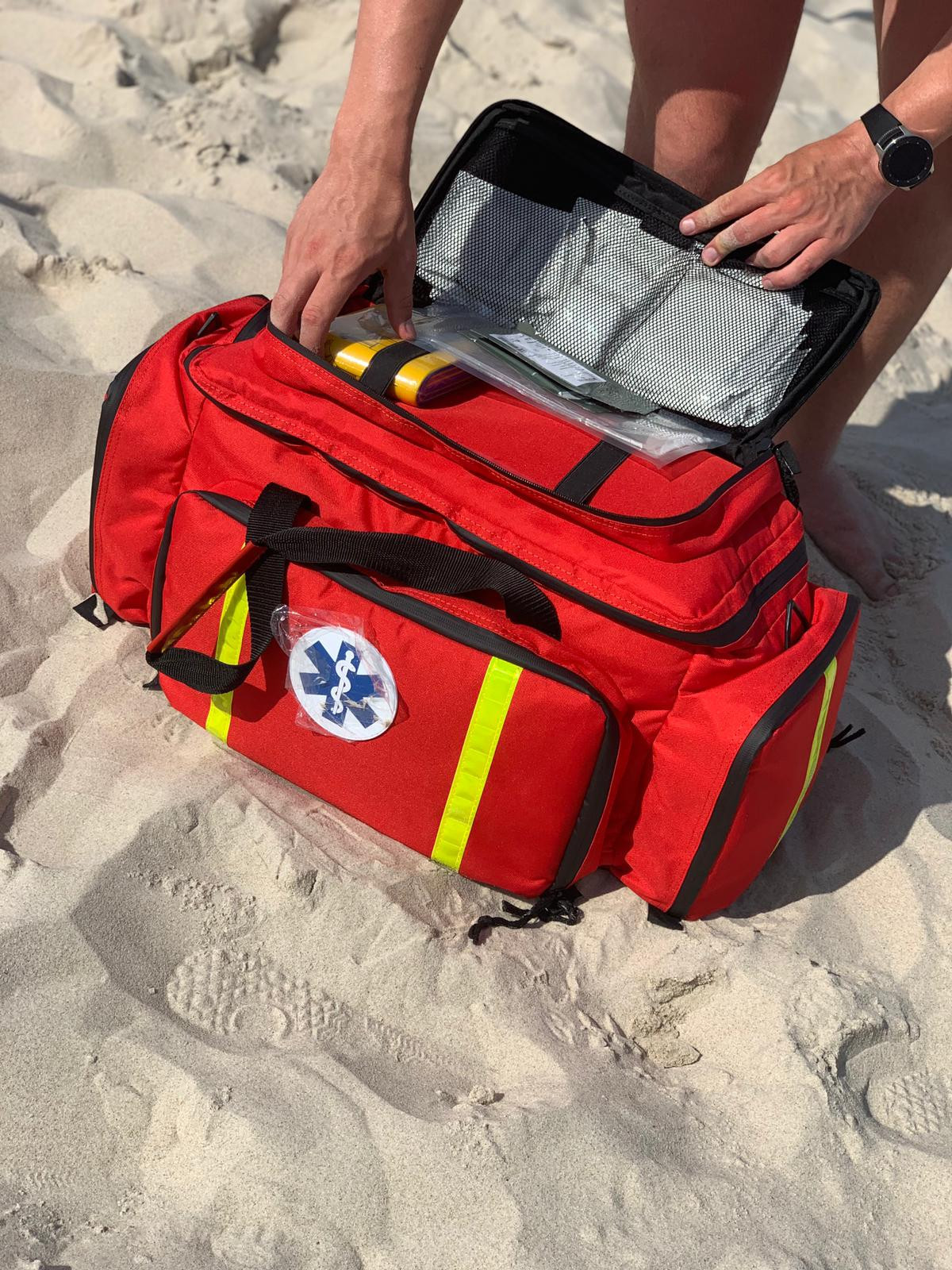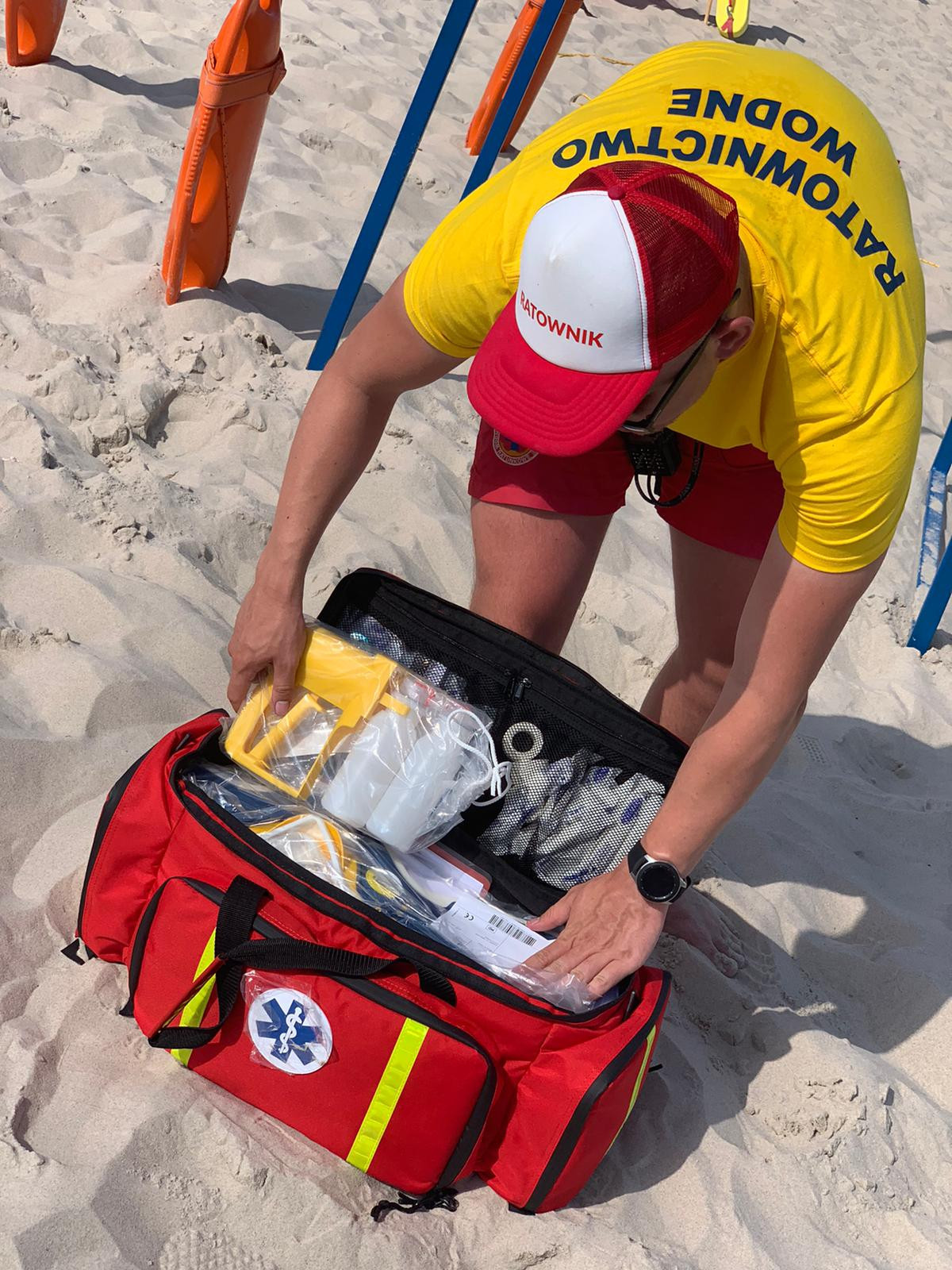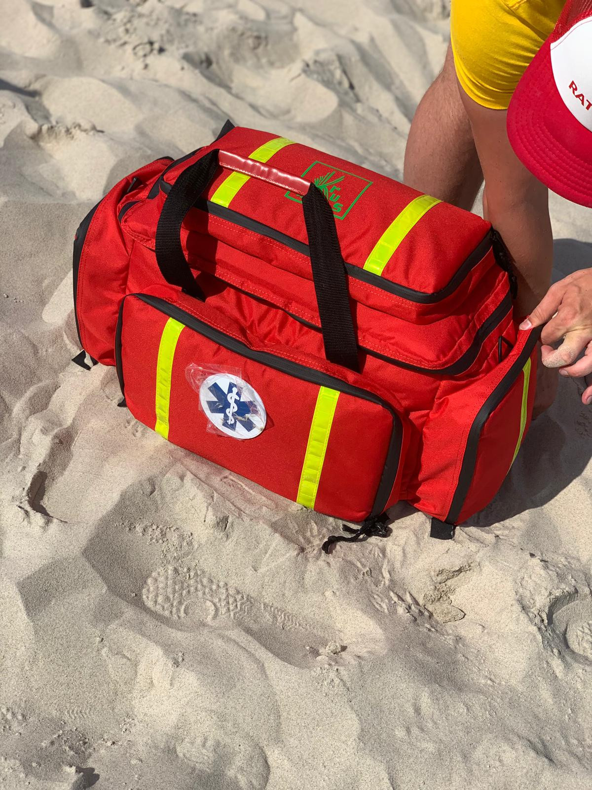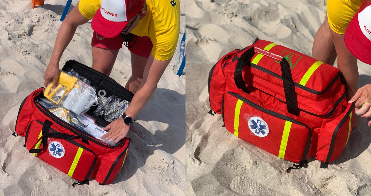 W torbie znajdują się m.in. certyfikowany tlen medyczny, ssak, którym można odsączyć wodę z dróg oddechowych, gdy wyjmowana jest osoba z wody (a to zdarza się bardzo często), środki do dezynfekcji rąk i bandaże.