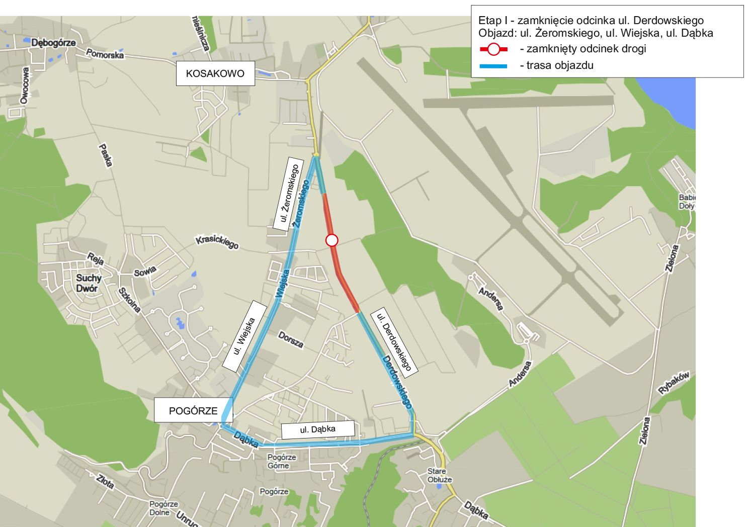 W związku z realizacją inwestycji drogowej prowadzonej w ciągu ulicy Derdowskiego pomiędzy ul. Miłosza i Pasażem Morskim w Kosakowie od poniedziałku (20 września) do czwartku (30 września) zamknięty będzie całkowicie odcinek drogi od wyjazdu z Pasażu Morskiego w Kosakowie do skrzyżowania z ul. Kościuszki w Pogórzu.