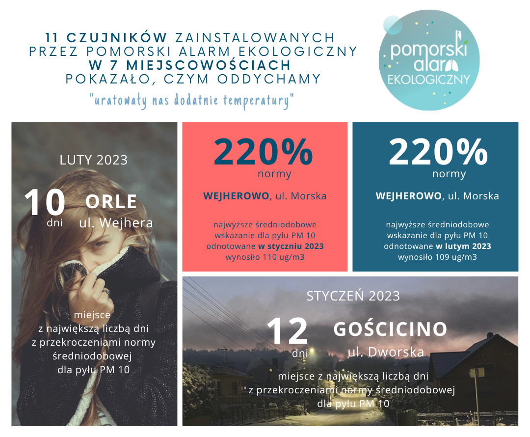 Pierwszy raport dotyczący 11 czujników jakości powietrza zainstalowanych przez Pomorski Alarm Ekologiczny w 7 miejscowościach (Wejherowie, Redzie, Rumi, Gościcinie, Strzebielinie, Bolszewie i Orlu) pokazuje, jakim powietrzem oddychali ich mieszkańcy w styczniu i lutym br. W tym czasie ujemne temperatury wystąpiły tylko 6-7 razy i to głównie nocą. W ciągu dnia temperatury prawie zawsze były dodatnie. Jeszcze do końca 2022 r. Reda, Bolszewo, Strzebielino i Gościcino, miejscowości zamieszkiwane łącznie przez ponad 45 tys. osób, nie posiadały żadnego czujnika! W której lokalizacji odnotowano szczególnie wysoki poziom zanieczyszczeń? Jak bardzo powietrze było zanieczyszczone w stosunku do obowiązujących norm?