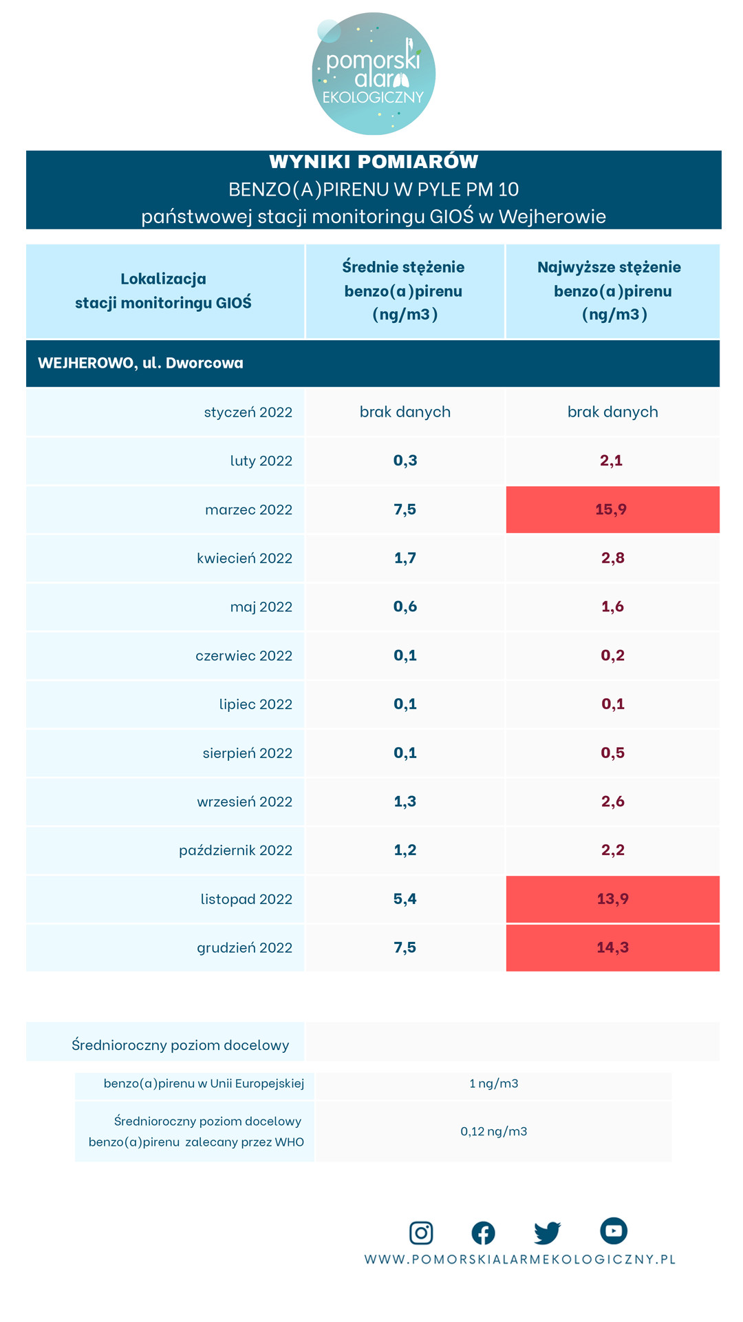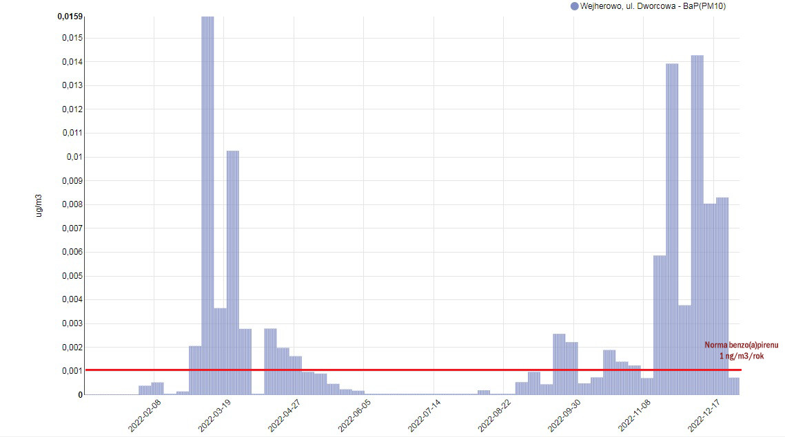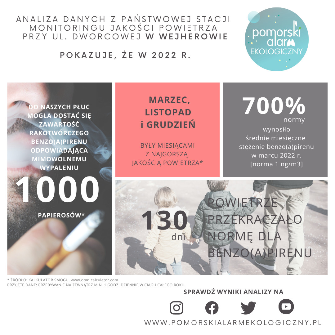 Średnioroczne stężenie benzo(a)pirenu w pyle PM 10 odnotowane na oficjalnej stacji monitoringu GIOŚ w Wejherowie w roku 2018 (tj. przed demontażem stacji) wynosiło 5 ng/m3, czyli 500% normy obowiązującej w Polsce. W skrócie - jakość powietrza była bardzo zła.