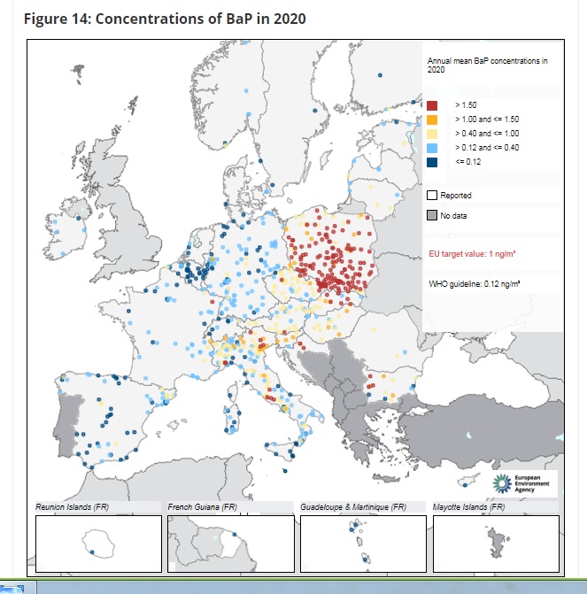 Średnioroczny poziom docelowy obowiązujący w UE to 1 ng/m3. Jednak biorąc pod uwagę niekorzystne skutki zdrowotne WHO zaleca utrzymanie poziomu docelowego na 0,12 ng/m3. Polska wypada na tle Europy bardzo źle, ponieważ średnioroczne stężenia rakotwórczego benzo(a)pirenu w Polsce w 2021 r. wg rankingu smogowych miast wynosiły 700-1500% dopuszczalnej normy.
