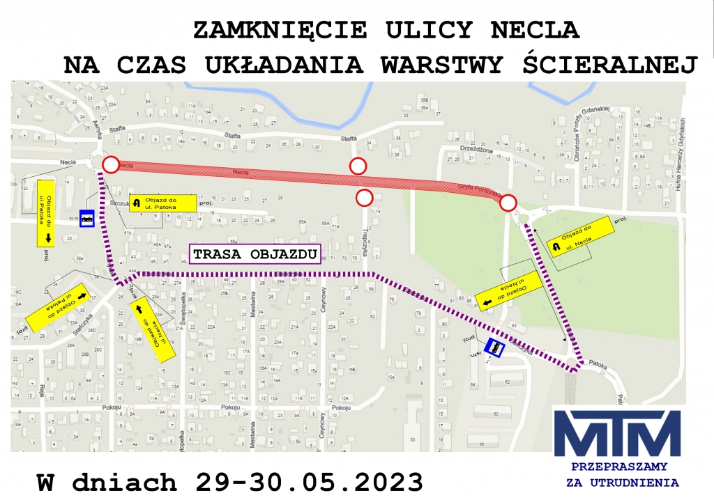 Na dwa dni - 29 i 30 maja 2023 roku zostanie zamknięta dla ruchu ul. Necla na odcinku od ronda z ul. Asnyka i Chmielewskiego do ronda z ul. Patoka. — Jest to związane z układaniem warstwy ścieralnej na całym odcinku tej ulicy - informuje wejherowski Urząd Miasta.