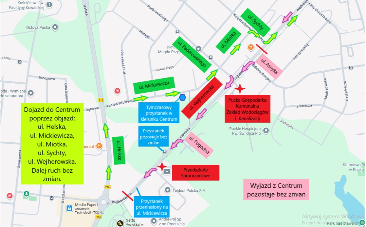 dojazd do centrum będzie odbywał się objazdem: z ronda ulicą Helską, następnie Mickiewicza, Miotka i Sychty,