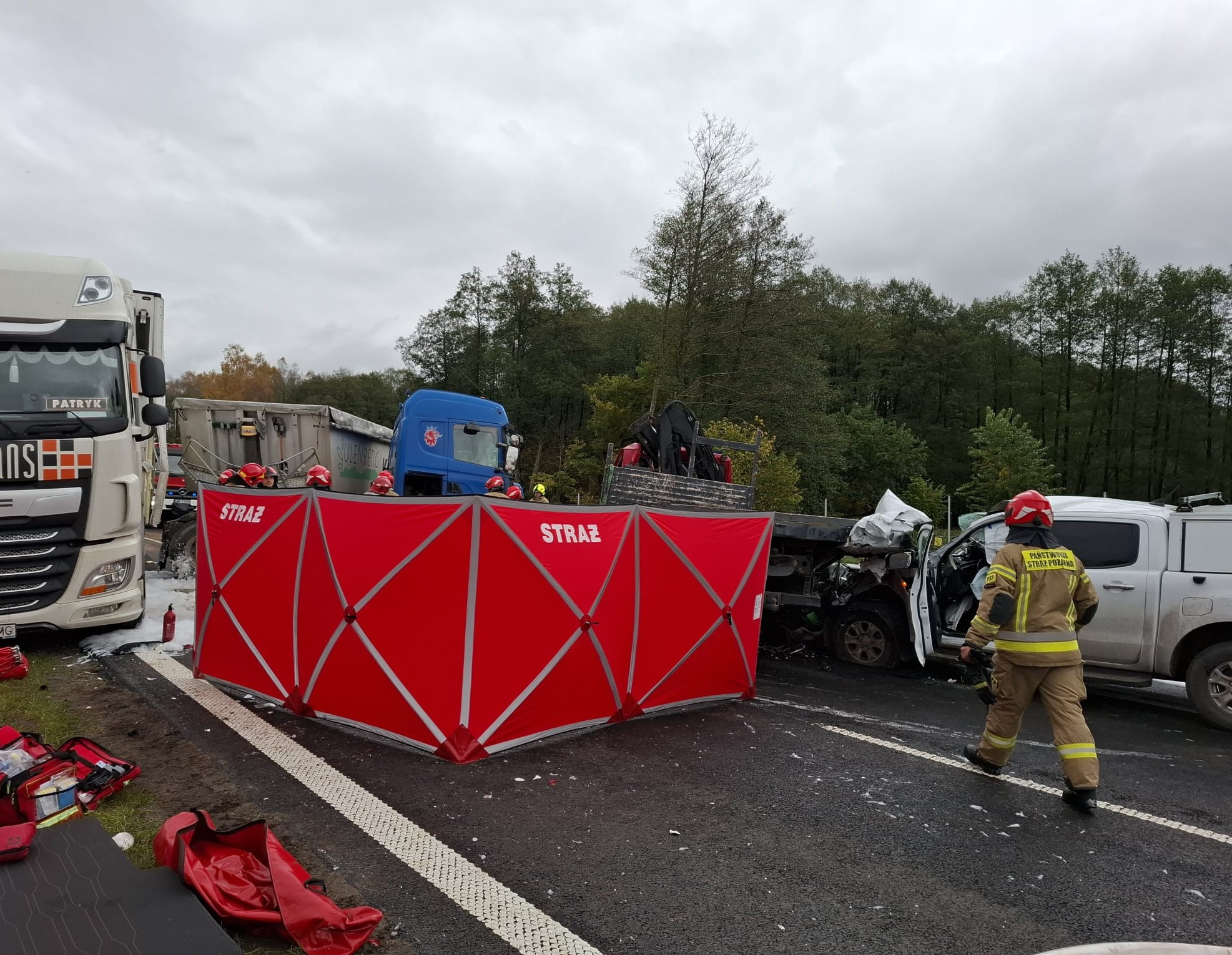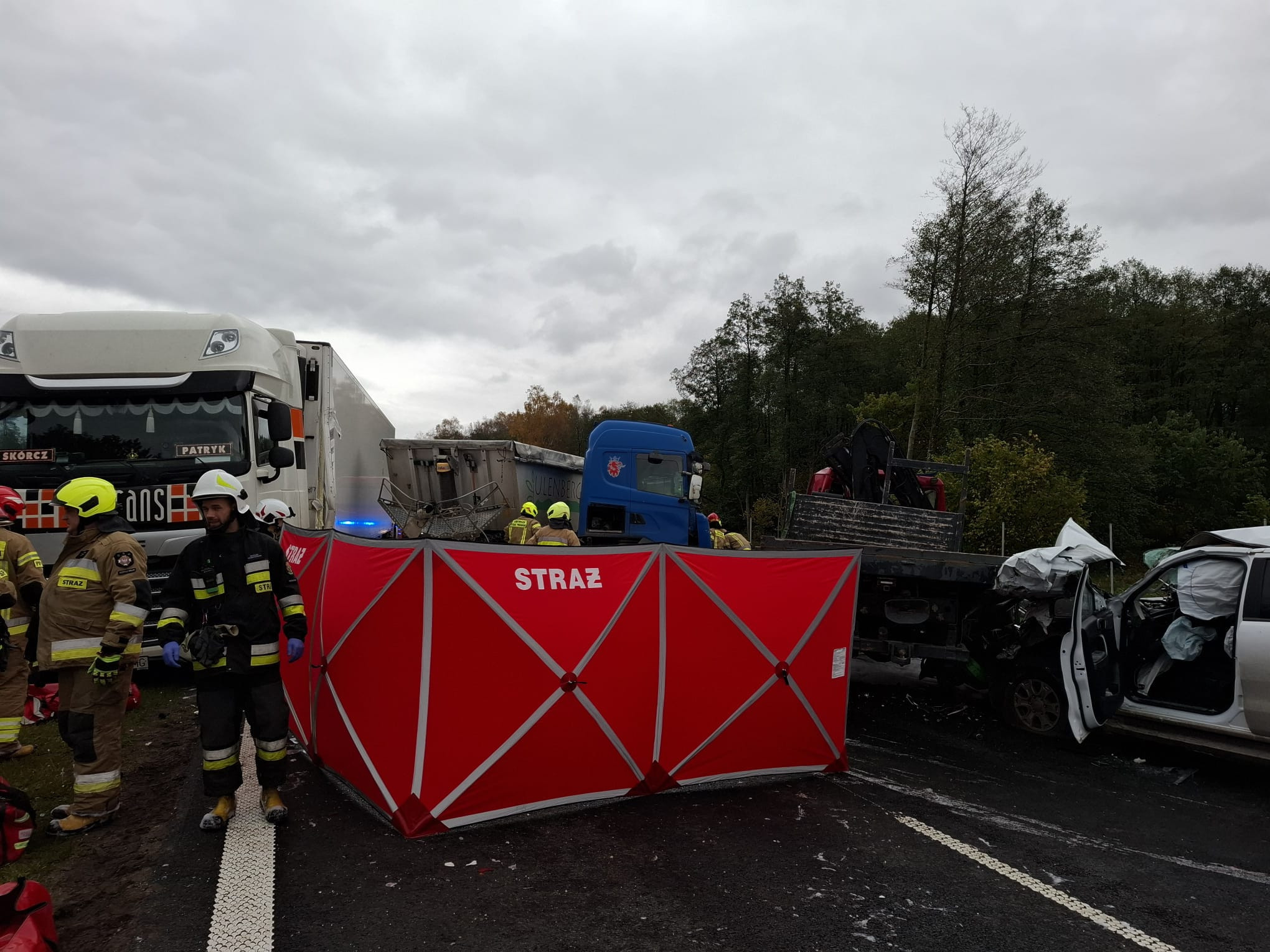 Tragiczny wypadek na Trasie Kaszubskiej w Wielistowie (gmina Łęczyce). Zderzyły się trzy ciężarówki i samochód osobowy. Jedna osoba zginęła na miejscu, a cztery zostały ranne. Ruch w obu kierunkach jest całkowicie zablokowany.
