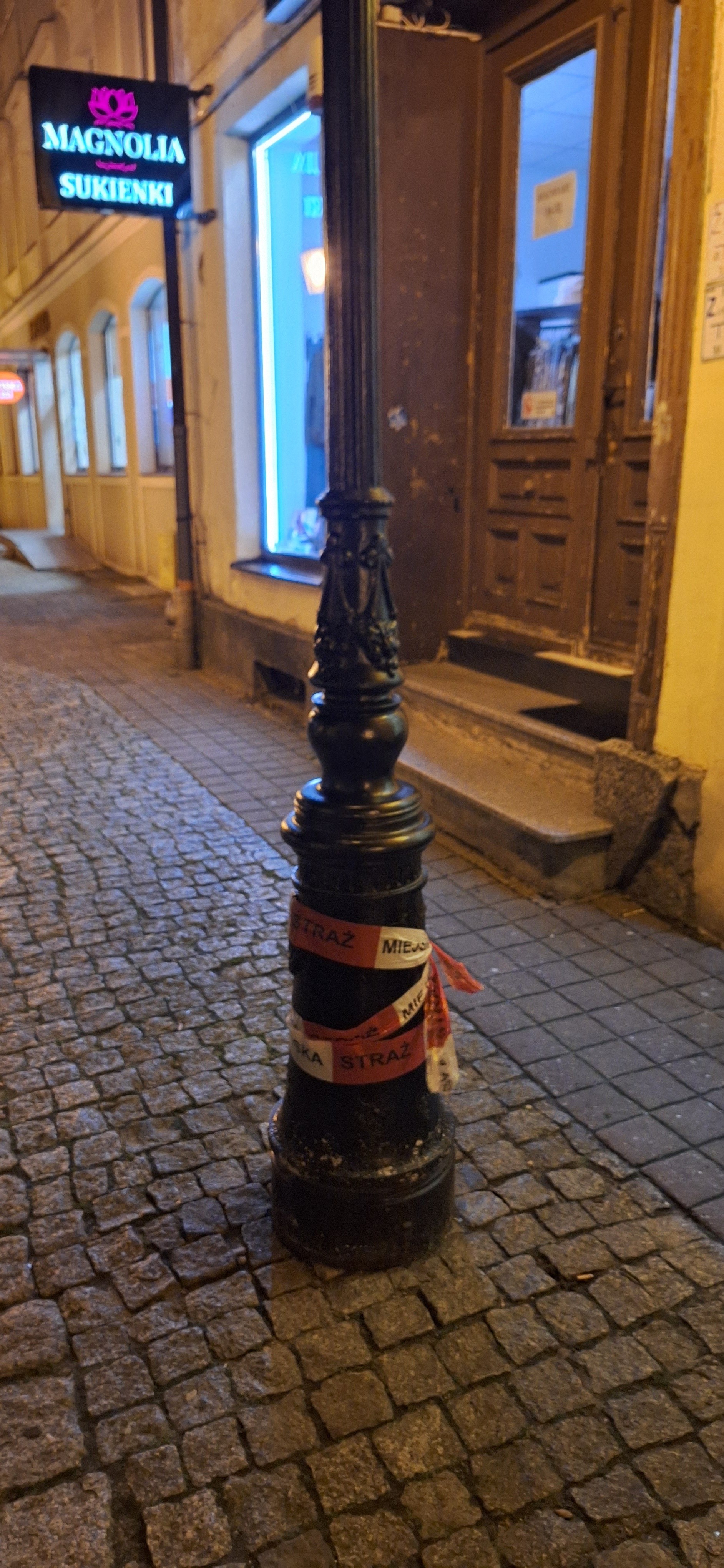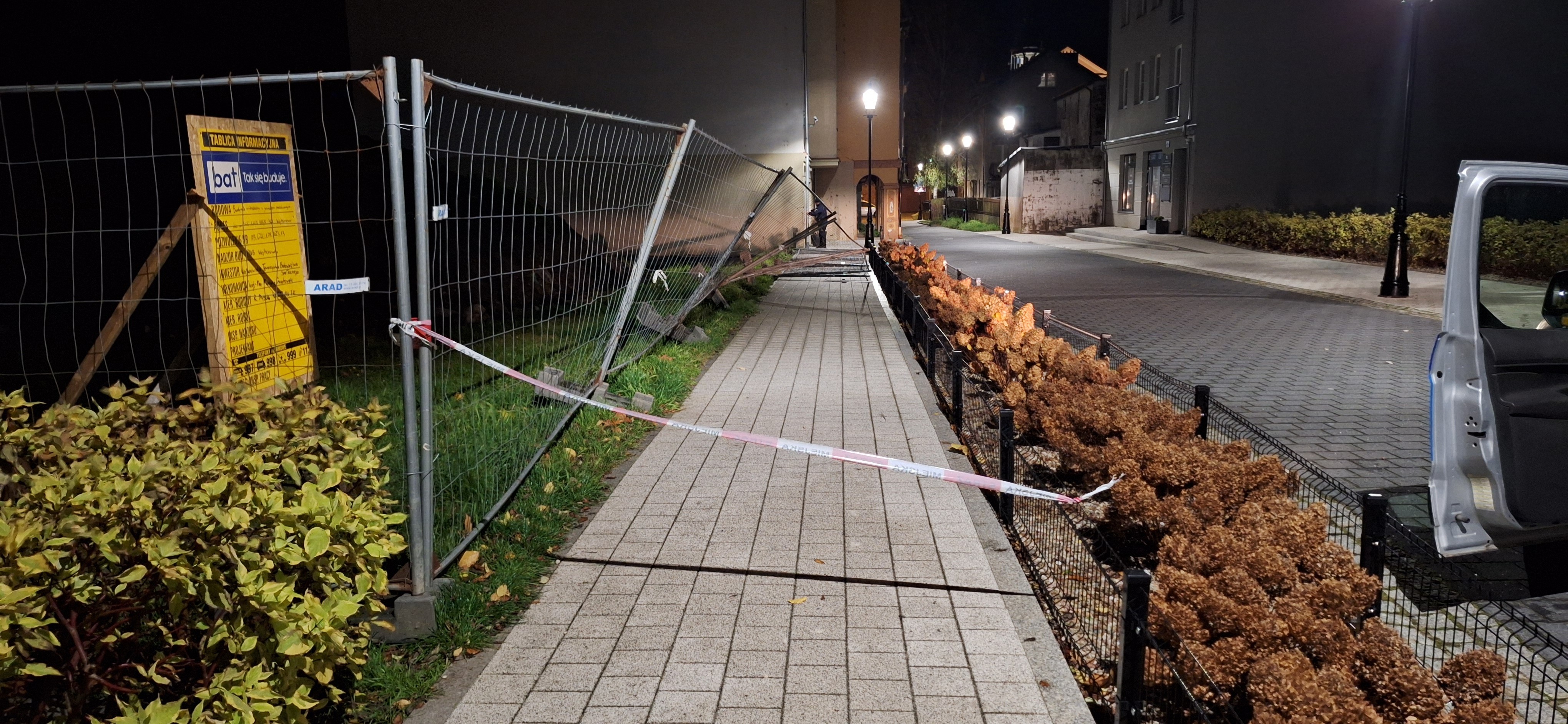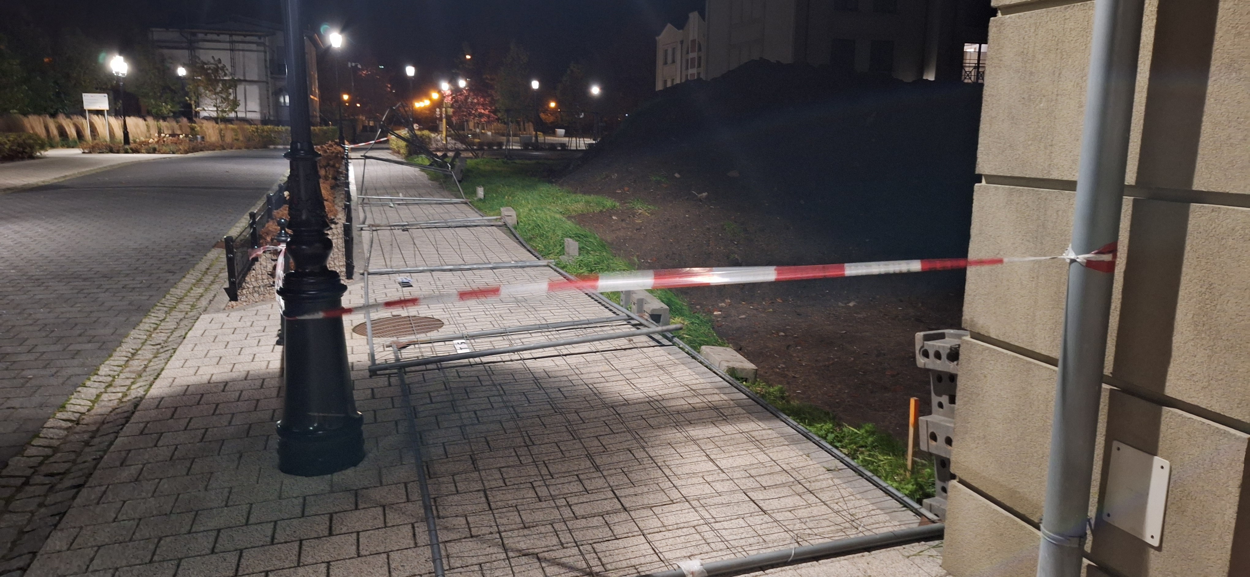 Kolejne zgłoszenie wpłynęło tuż przed godziną 23:00. Na ulicy św. Anny silny wiatr przewrócił ogrodzenie z pobliskiej budowy. W tym samym czasie na Placu Jakuba Wejhera doszło do uszkodzenia lampy ulicznej – wiatr zerwał zabezpieczenie kabli elektrycznych.
