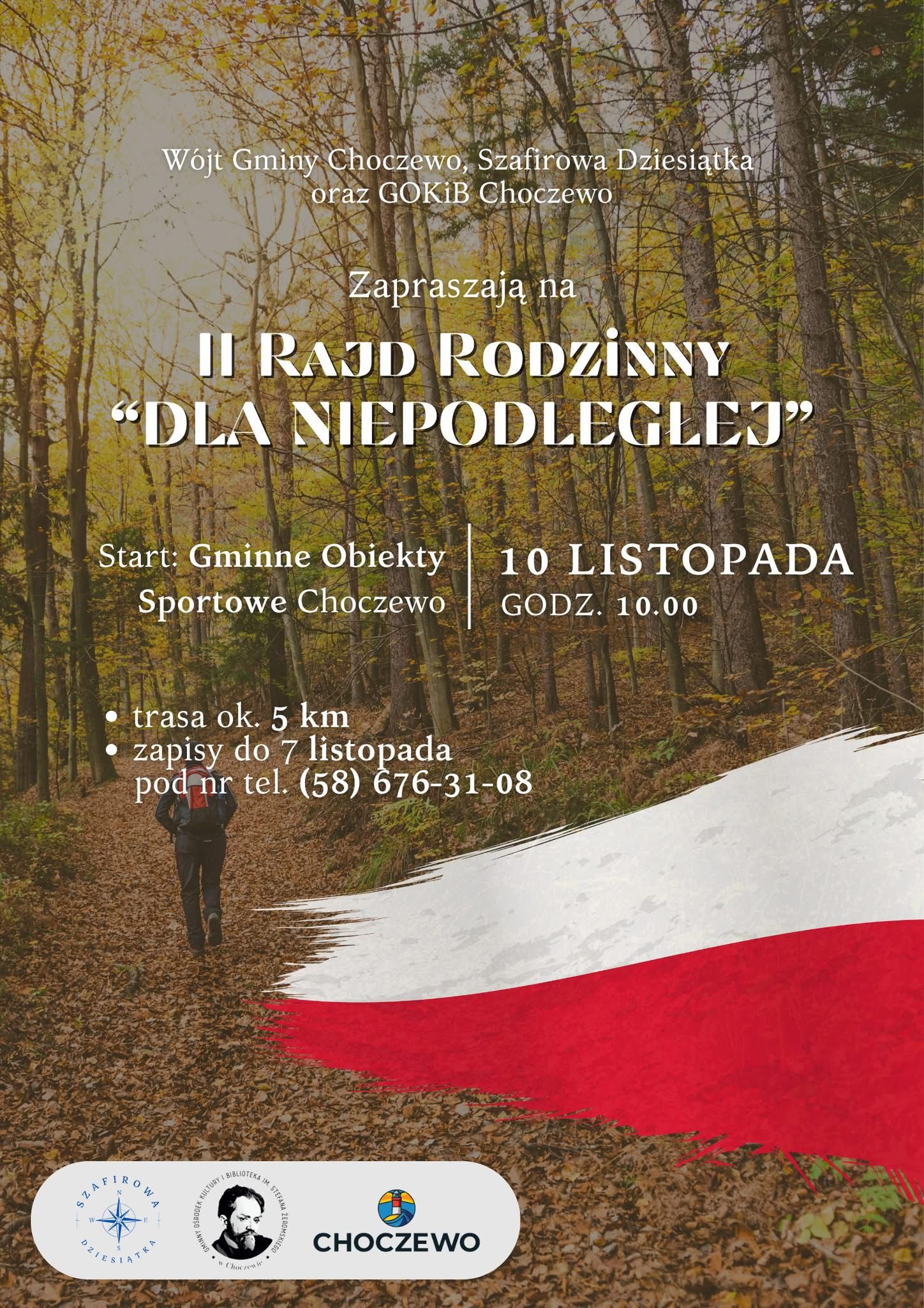 Na sportowo Narodowe Święto Niepodległości uczczą w gminie Choczewo. 10 listopada odbędzie się II Rajd Rodzinny "Dla Niepodległej". Uczestnicy do pokonania będą mieli dystans 5 km. Start zlokalizowany będzie na terenie Gminnych Obiektów Sportowych. Zapisy są do 7 listopada pod nr tel. (58) 676-31-08.