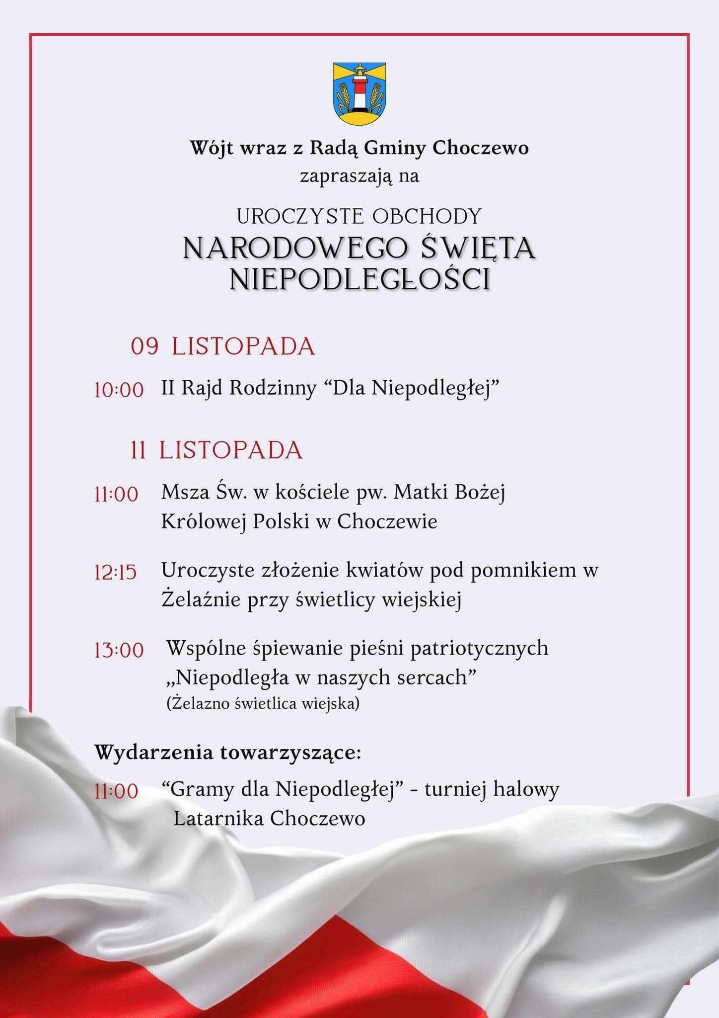Uroczyste obchody w gminie Choczewo rozpoczną się 11 listopada o godz. 11 mszą św. w kościele pw. Matki Bożej Królowej Polski w Choczewie. O godz. 12.15 pod pomnikiem w Żelaźnie przy świetlicy wiejskiej odbędzie się uroczyste złożenie kwiatów. A o godz. 13 w świetlicy wiejskiej również w Żelaźnie będzie miało miejsce wspólne śpiewanie pieśni patriotycznych.