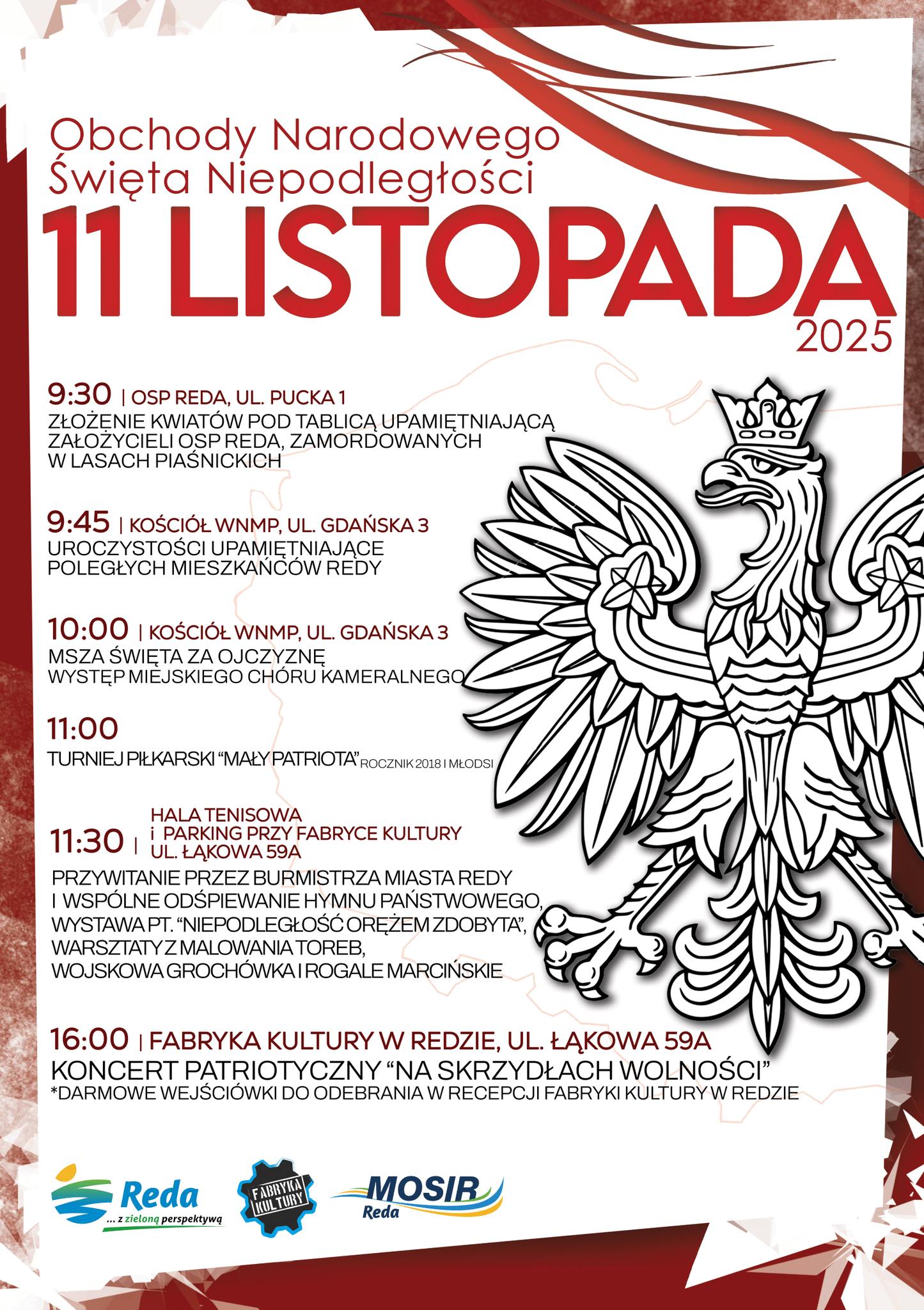 W Redzie obchody zainauguruje złożenie kwiatów pod tablicą upamiętniającą założycieli OSP Reda, zamordowanych w Lasach Piaśnickich (godz. 9.30). O godz. 10 rozpocznie się msza św. za Ojczyznę w kościele parafialnym pw. WNMP przy ul. Gdańskiej 3. Podczas obchodów zaplanowano też turniej piłkarski "Mały Patriota" i koncert patriotyczny "Na skrzydłach wolności". Szczegóły na plakacie poniżej.