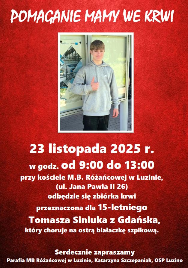 Już w najbliższą niedzielę, 23 listopada, mieszkańcy Luzina i okolic będą mogli w wyjątkowy sposób okazać swoją solidarność i wsparcie. Tego dnia odbędzie się zbiórka krwi dla 15-letniego Tomasza Siniuka z Gdańska, który zmaga się z ostrą białaczką szpikową – chorobą wymagającą intensywnego leczenia i systematycznych transfuzji.