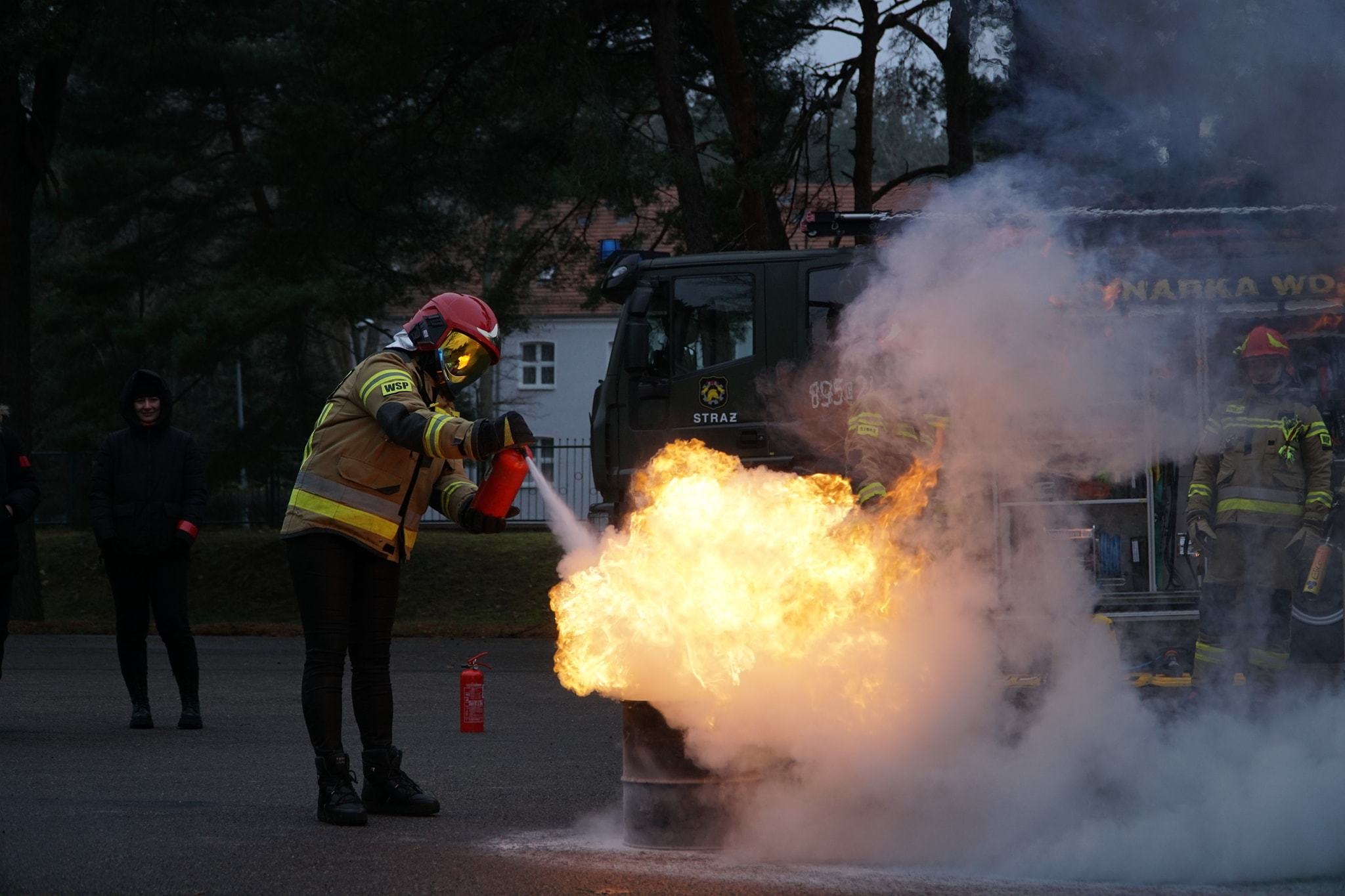 Atrakcją szkolenia było gaszenie pożaru. Ochotnicy ubrani w odpowiedni strój używając gaśnic proszkowych walczyli z żywiołem pod okiem straży pożarnej. Żołnierze zaprowadzili także uczestników do schronu na terenie CSMW. Zanim do niego weszliśmy, zaprezentowano nam sygnały alarmowe - ogłoszenie i odwołanie.