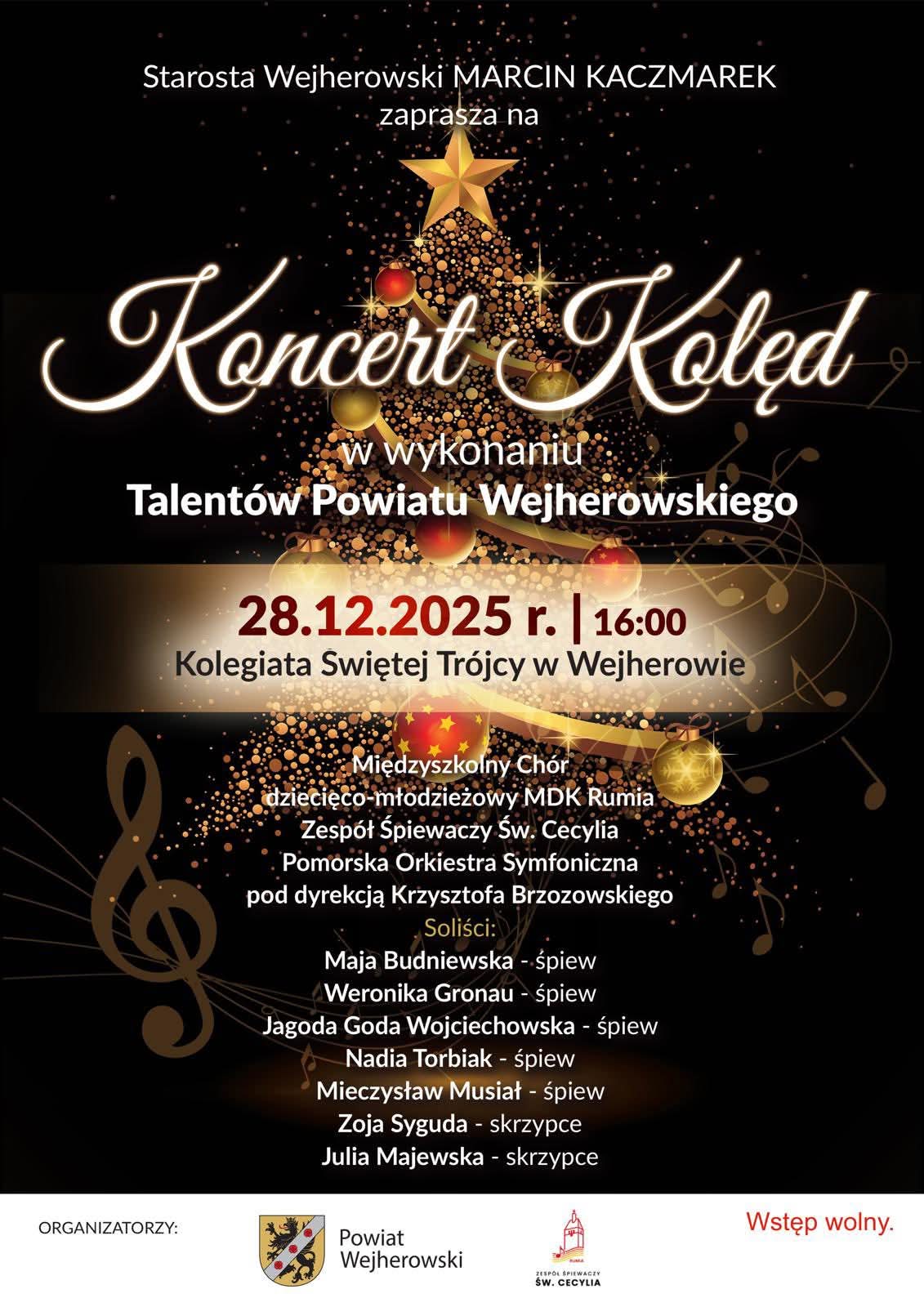 Publiczność usłyszy również solistów: Maję Budniewską, Weronikę Gronau, Jagodę Godę Wojciechowską, Nadię Torbiak i Mieczysława Musiała w partiach wokalnych, a także Zoję Sygudę i Julię Majewską grające na skrzypcach. Wydarzenie zaplanowano na 28 grudnia 2025 roku o godzinie 16 w Kolegiacie Świętej Trójcy w Wejherowie.