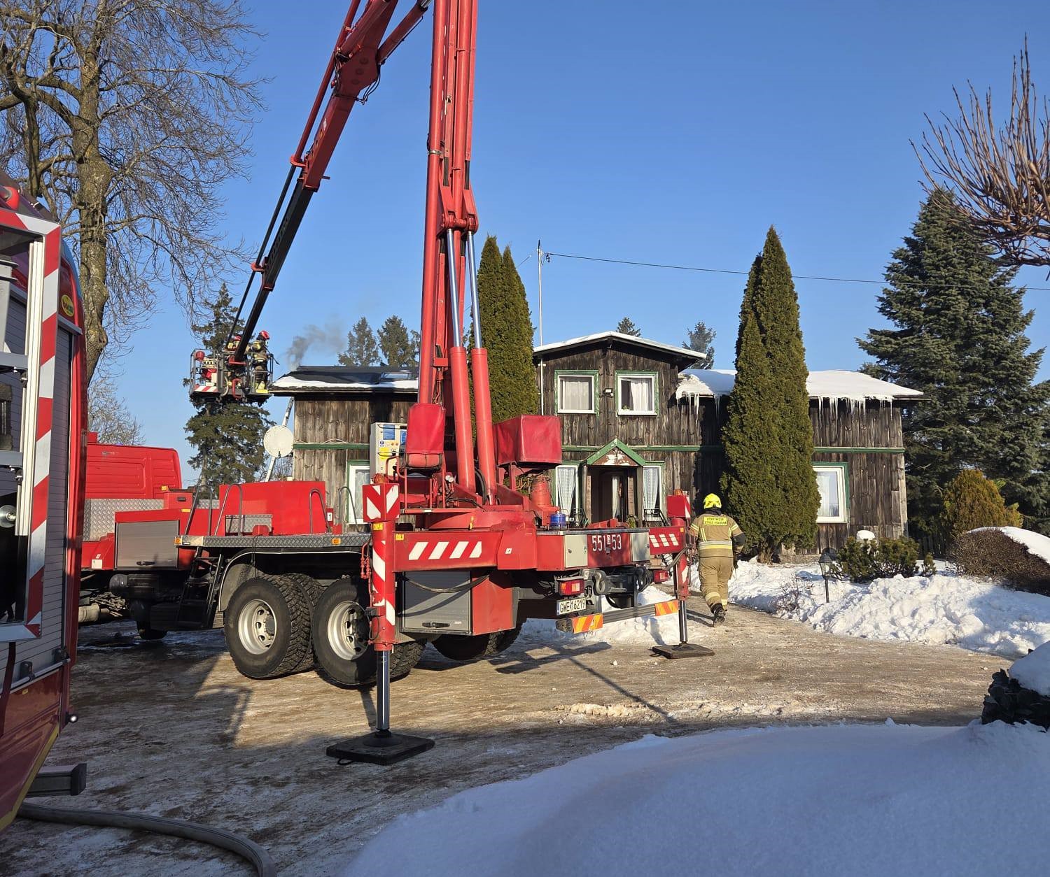 Zgłoszenie wpłynęło do służb ratunkowych o godzinie 10:51. Na miejsce natychmiast skierowano znaczne siły straży pożarnej – cztery zastępy Państwowej Straży Pożarnej oraz pięć jednostek Ochotniczej Straży Pożarnej. Strażacy prowadzą na miejscu działania gaśnicze oraz zabezpieczają obiekt, aby ogień nie rozprzestrzenił się na pozostałe części budynku.