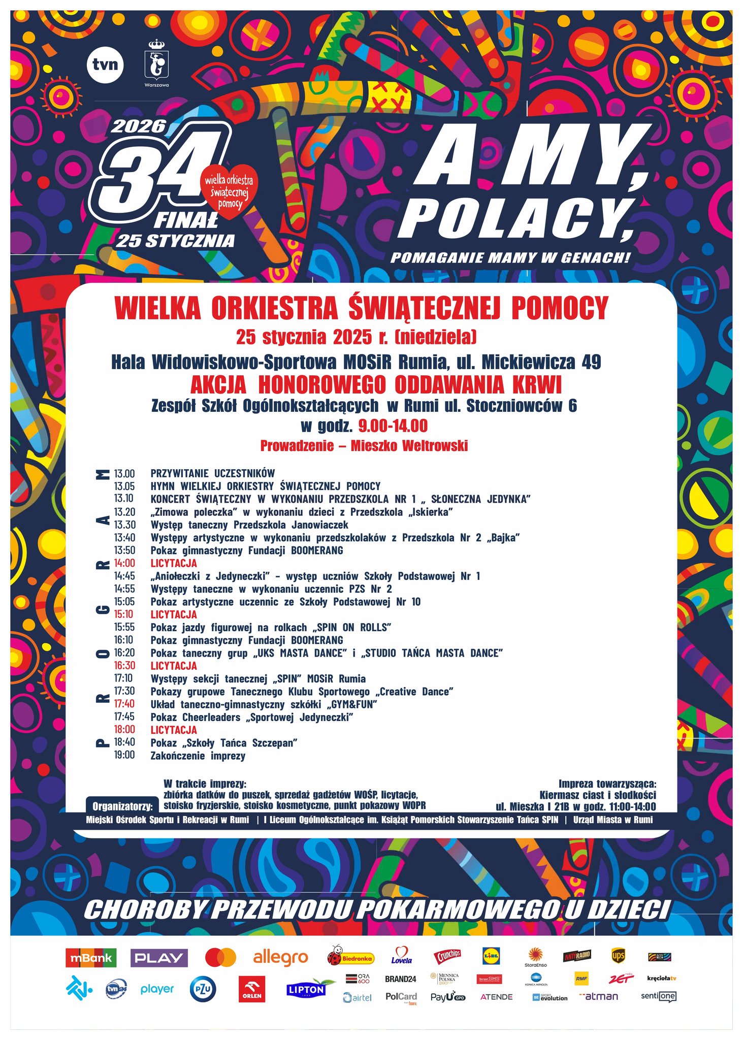 Rumia włączy się w ogólnopolskie granie podczas 34. Finału Wielkiej Orkiestry Świątecznej Pomocy. Główne wydarzenia odbędą się w Hali Widowiskowo-Sportowej MOSiR przy ul. Mickiewicza 49, gdzie zaplanowano bogaty program artystyczny, licytacje oraz atrakcje dla całych rodzin.