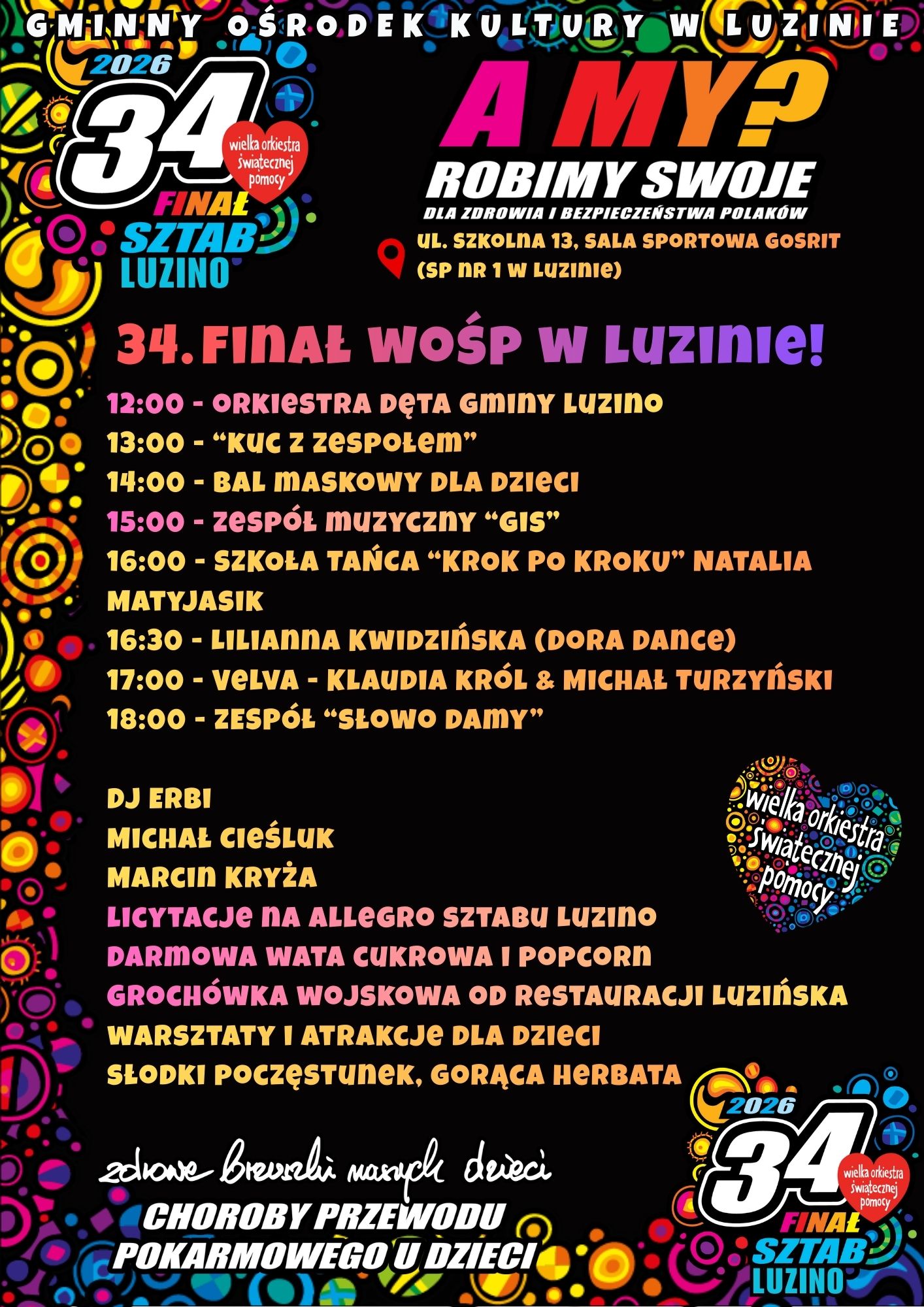 W powiecie wejherowskim jednym z wydarzeń będzie 34. Finał WOŚP w Luzinie, który odbędzie się w sali sportowej GOSRiT przy ul. Szkolnej. Start zaplanowano na godzinę 12:00. Na scenie wystąpi Orkiestra Dęta Gminy Luzino, zespoły muzyczne, tancerze i lokalni artyści. Dla dzieci przygotowano bal maskowy, warsztaty i liczne atrakcje, a na wszystkich uczestników czekać będzie wojskowa grochówka, wata cukrowa, popcorn i słodki poczęstunek. Ważnym elementem wydarzenia będą również licytacje prowadzone zarówno na miejscu, jak i internetowo.