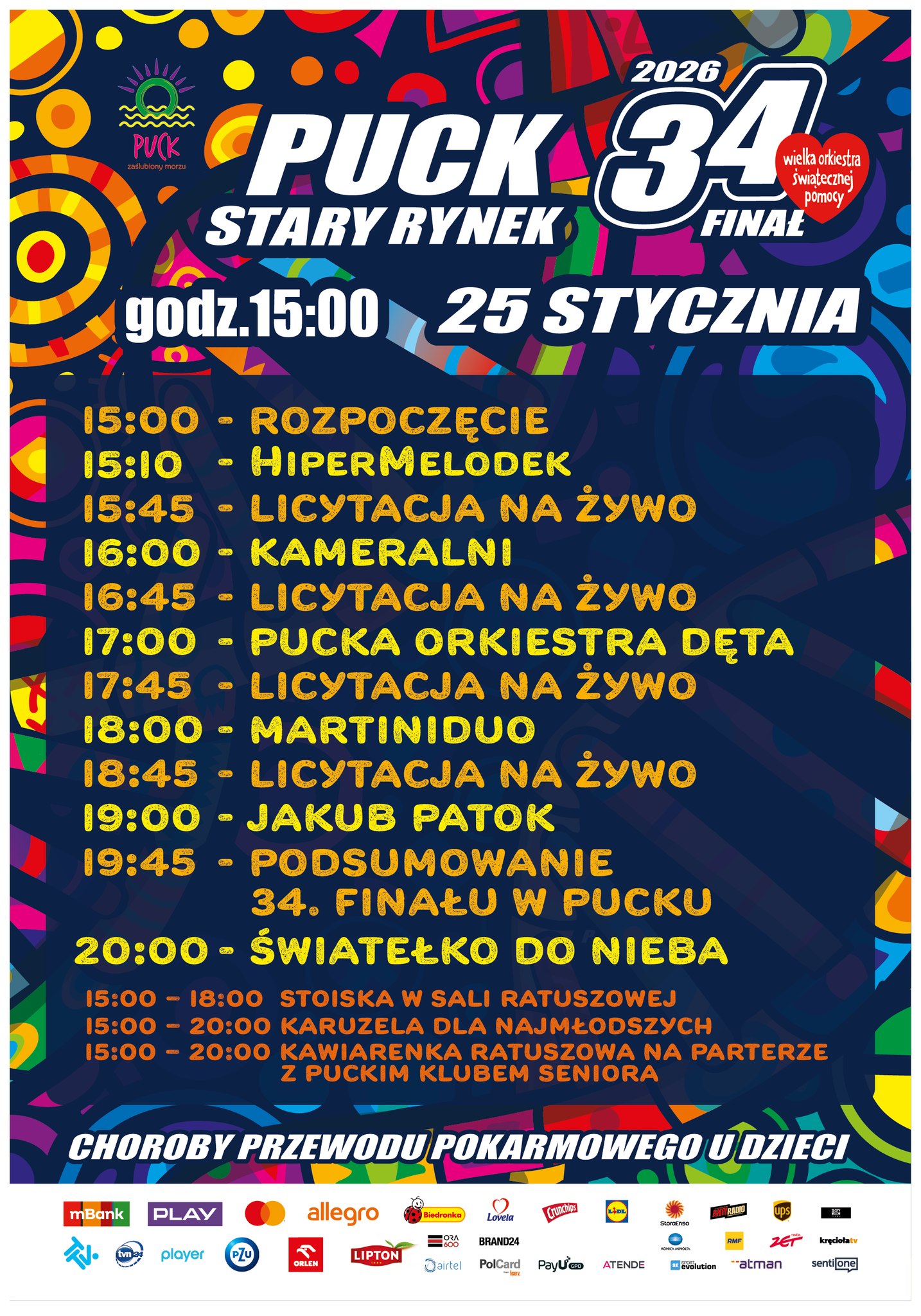 Jednym z głównych punktów finału w powiecie puckim będzie Stary Rynek w Pucku, gdzie wydarzenia rozpoczną się o godzinie 15:00. Na scenie pojawią się m.in. Hipermelodek, zespół Kameralni, Pucka Orkiestra Dęta, Martinidoo oraz Jakub Patok. Między występami zaplanowano licytacje na żywo, które od lat są jednym z najbardziej emocjonujących elementów finału. Całość zakończy się o godzinie 20:00 tradycyjnym „Światełkiem do Nieba”.