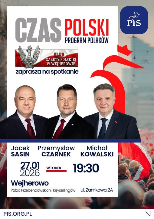 W Wejherowie odbędzie się spotkanie z posłami Prawa i Sprawiedliwości. Będą w nim uczestniczyć Jacek Sasin, Przemysław Czarnek i Michał Kowalski. Spotkanie będzie otwarte, a jego organizatorem jest Klub Gazety Polskiej w Wejherowie.