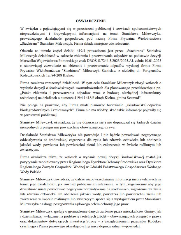 W związku z pojawiającymi się w przestrzeni publicznej i serwisach społecznościowych nieprawdziwymi i krzywdzącymi informacjami na temat Stanisława Milewczyka, prowadzącego działalność gospodarczą pod nazwą Firma Prywatna Wielobranżowa „Stachtrans” Stanisław Milewczyk, Firma składa niniejsze oświadczenie. Obecnie na terenie części działki 419/4 prowadzona jest przez „Stachtrans” Stanisław Milewczyk działalność w zakresie zbierania i przetwarzania odpadów na podstawie decyzji Marszałka Województwa Pomorskiego znak DROŚ S.7244.5.2023/2025.AŁ z dnia 10.01.2025 r. stanowiącej zezwolenie na zbieranie i przetwarzanie odpadów wydanej firmie Firma Prywatna Wielobranżowa "Stachtrans" Milewczyk Stanisław z siedzibą ul. Partyzantów Koleczkowskich 1a, 84-208 Kielno. Firma zamierza rozszerzyć działalność. W tym celu Stanisław Milewczyk złożył wniosek o wydanie decyzji o środowiskowych uwarunkowaniach dla planowanego przedsięwzięcia pn. „Punkt zbierania i przetwarzania odpadów wraz z budową niezbędnej infrastruktury technicznej na działkach o numerze 419/4 i 418/6 obręb Kielno, gmina Szemud”. Nie polega na prawdzie, aby Firma miała planować budowanie „składowiska odpadów biodegradowalnych i zmieszanych”. Firma nie ma wiedzy, skąd takie informacje pojawiły się w przestrzeni publicznej. Stanisław Milewczyk oświadcza, że nie dopuszcza się i nie dopuszczał się żadnych działań niezgodnych z przepisami powszechnie obowiązującego prawa. Działalność Stanisława Milewczyka nie powoduje i nie będzie powodować negatywnego oddziaływania na środowisko, zagrożenia dla życia lub zdrowia człowieka lub obniżenia jakości wody, powietrza lub powierzchni ziemi lub zniszczenia w świecie roślinnym lub zwierzęcym. Firma oświadcza także, że wniosek o wydanie nowej decyzji środowiskowej został już pozytywnie zaopiniowany przez Regionalnego Dyrektora Ochrony Środowiska oraz Dyrektora Regionalnego Zarządu Gospodarki Wodnej w Gdański Państwowego Gospodarstwa Wodnego Wody Polskie Stanisław Milewczyk oświadcza, że dalsze rozpowszechnianie informacji nieprawdziwych na temat jego działalności, jak również publiczne zniesławianie, w tym, sugerowanie aby jego działalność miała powodować negatywne oddziaływanie na środowisko, zagrożenie dla życia lub zdrowia człowieka lub obniżenia jakości wody, powietrza lub powierzchni ziemi lub zniszczenie w świecie roślinnym lub zwierzęcym spotka się z wystąpieniem przez Stanisława Milewczyka na drogę postępowania sądowego celem ochrony jego praw. Stanisław Milewczyk apeluje o gromadzenie danych zarówno przez mieszkańców Gminy, jak i dziennikarzy, wyłącznie na podstawie rzetelnych źródeł – obowiązujących przepisów prawa oraz dokumentów dotyczących inwestycji Strony – z uwzględnieniem przepisów Kodeksu cywilnego i Prawa prasowego określających granice dopuszczalnej wypowiedzi.