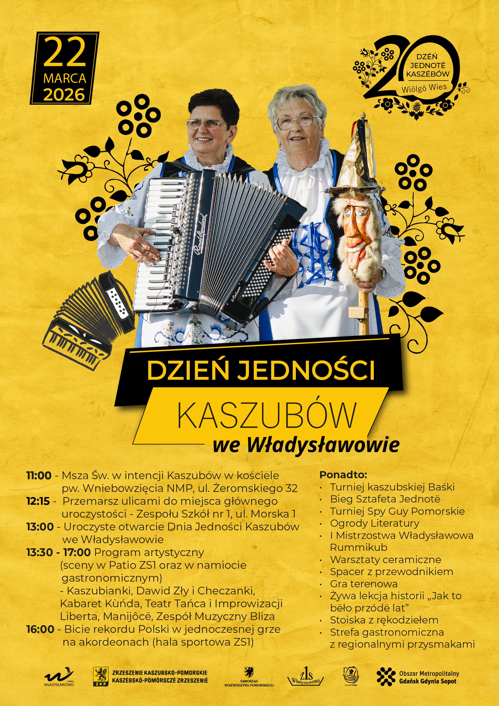Jednym z najbardziej widowiskowych punktów programu będzie bicie rekordu Polski w jednoczesnej grze na akordeonach, które na stałe wpisało się w tradycję Dnia Jedności Kaszubów i od lat gromadzi muzyków w różnym wieku. Pod dowództwem Mistrza, wybitnego akordeonisty Pawła A. Nowaka czas pokazać siłę muzyki w sercu kaszubskiej ziemi.