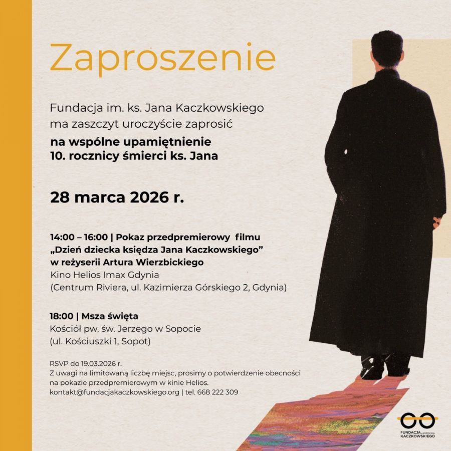 28 marca minie 10 lat od śmierci duchownego. Fundacja im. ks. Jana Kaczkowskiego organizuje wspólne upamiętnienie okrągłej rocznicy jego śmierci. Tego dnia w kinie w Centrum Riviera w Gdyni w godz. 14 - 16 odbędzie się pokaz przedpremierowy filmu "Dzień dziecka księdza Jana Kaczkowskiego w reżyserii Artura Wierzbickiego. Natomiast o godz. 18 w kościele im. pw. św. Jerzego w Sopocie przy ul. Kościuszki 1 odprawiona zostanie msza św.