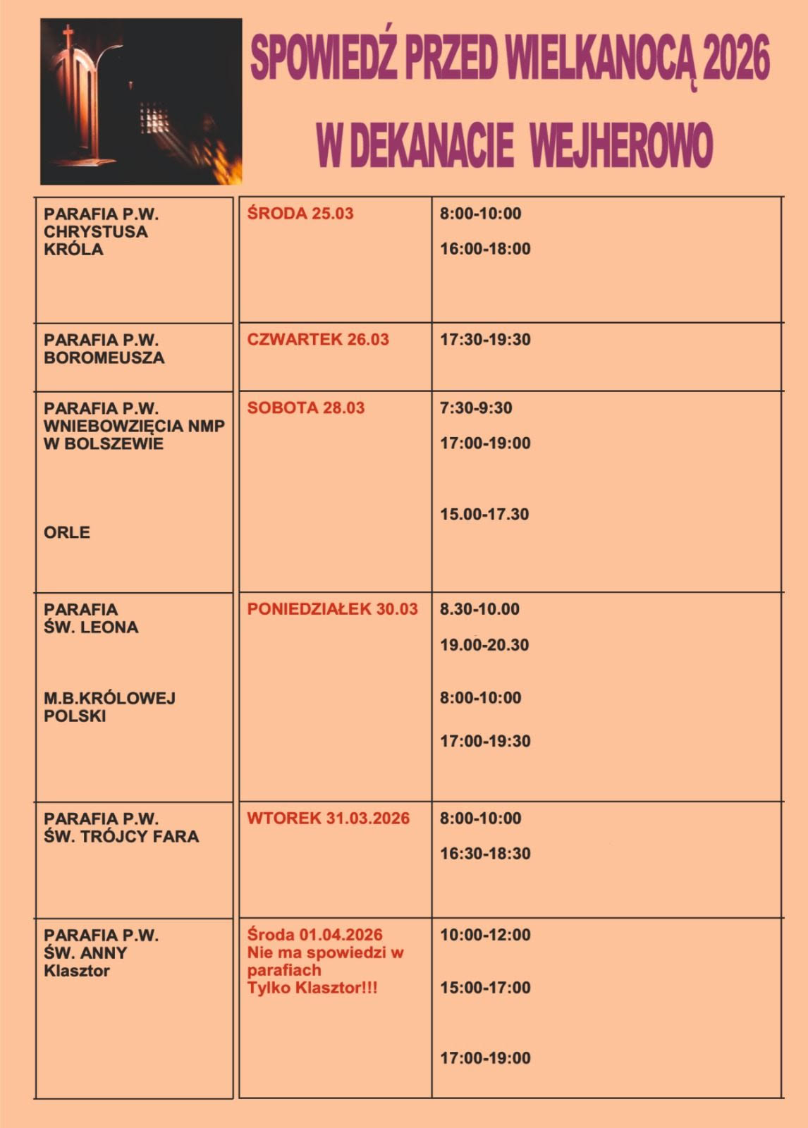 Harmonogram dyżurów spowiedziowych w dekanacie wejherowskim: