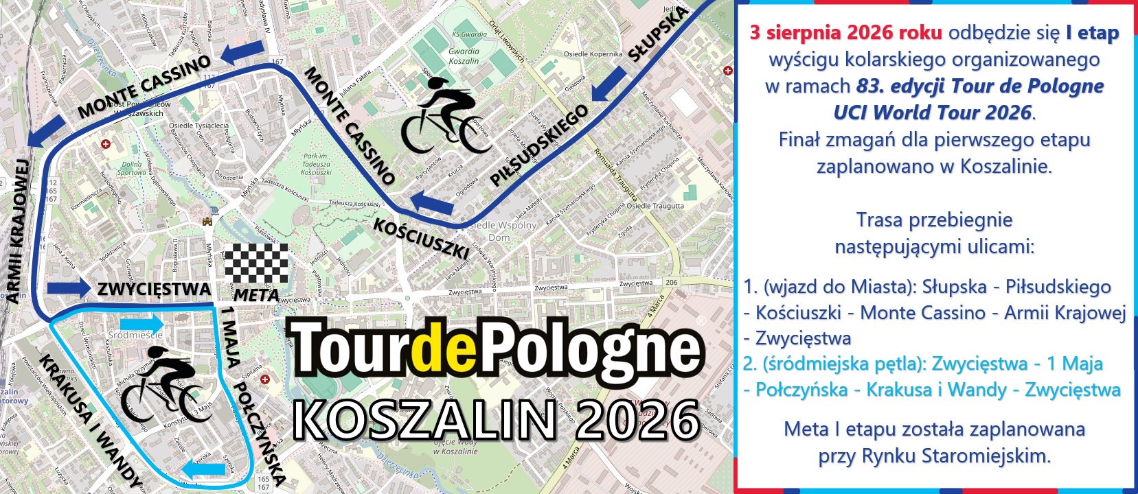 — Cieszę się, że na mapie Tour de Pologne pojawia się Koszalin. Startujemy w Gdyni - w roku jej 100-lecia - a kończymy etap w Koszalinie, który świętuje 760-lecie nadania praw miejskich - podkreśla Czesław Lang, dyrektor generalny wyścigu. - To sprawia, że zarówno start, jak i meta będą miały wyjątkowy, historyczny wymiar i szczególną oprawę. Ten etap będzie dla mnie także niezwykle sentymentalny. Trasa poprowadzi przez Bytów, gdzie zaczynałem swoją sportową drogę w klubie „Baszta” Bytów, a także przez Kołczygłowy - miejscowość, w której się urodziłem i gdzie dziś znajduje się szkoła mojego imienia. Dlatego pierwszy etap jest mi szczególnie bliski i ma dla mnie bardzo osobiste znaczenie- dodaje.