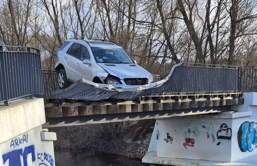 Samochód dosłownie zawisł na moście. Nie wiadomo jak doszło do tego zdarzenia, a pozycja w jakiej znalazło się auto wygląda nieprawdopodobnie.