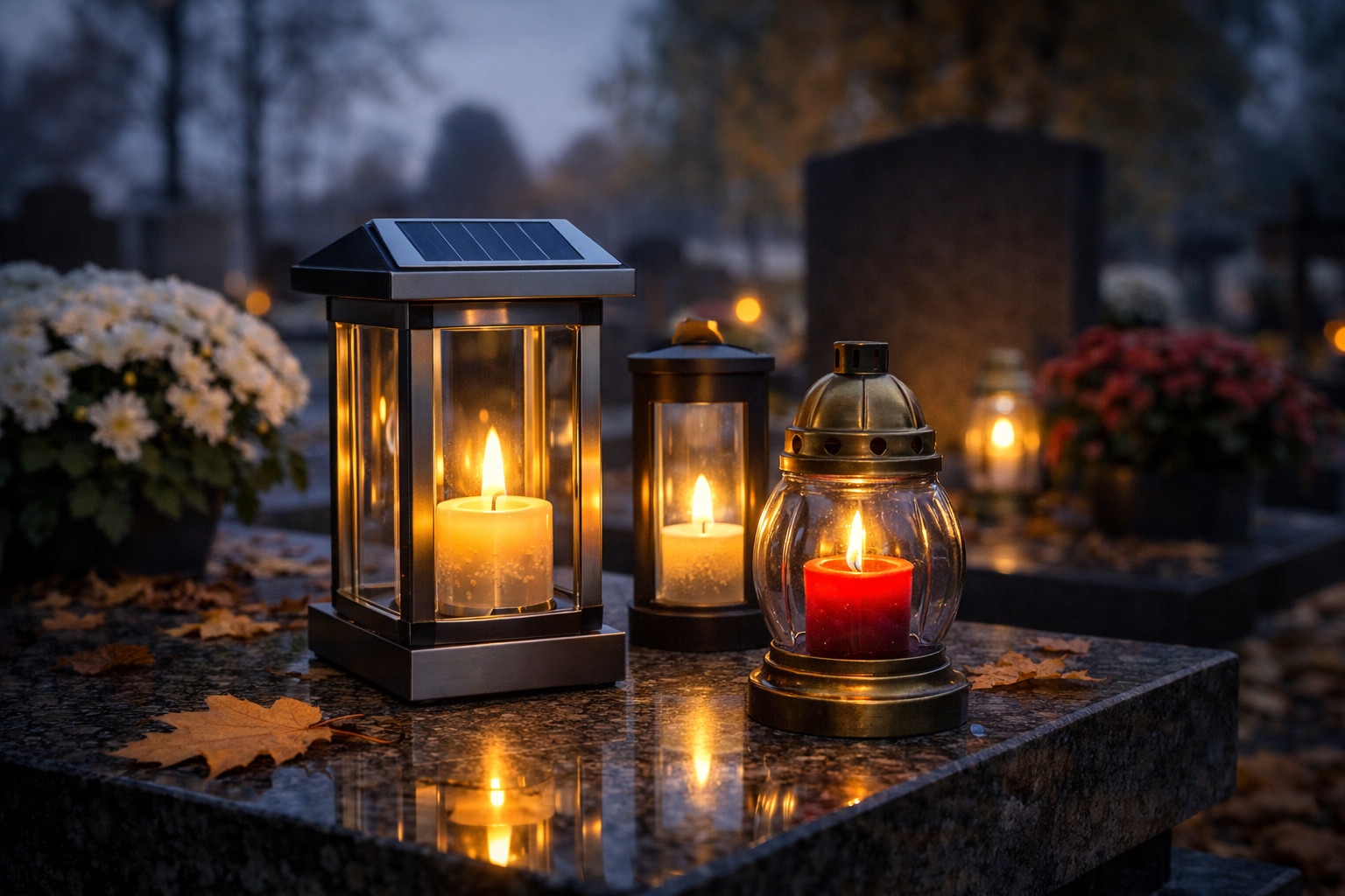 Dobrze sprawdzają się lampiony i modele o bardziej uporządkowanej formie, bo łatwiej wkomponować je w całość. Nie trzeba wtedy kombinować z pięcioma różnymi ozdobami, żeby osiągnąć sensowny efekt. Czasem mniej naprawdę znaczy więcej. I nie, to nie jest tylko frazes z katalogu wnętrzarskiego. Na cmentarzu też działa.