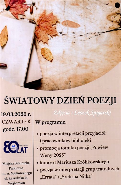 W Miejskiej Bibliotece Publicznej w Wejherowie zorganizowano Światowy Dzień Poezji. W programie znalazły się poezja w interpretacji przyjaciół i pracowników biblioteki, promocja tomiku poezji "Powiew Weny 2025", koncert Mariusza Królikowskiego oraz poezja w interpretacji grup teatralnych "Errata" i "Srebrna Nitka".