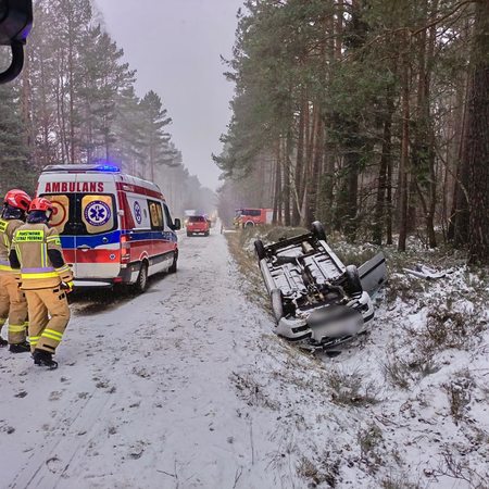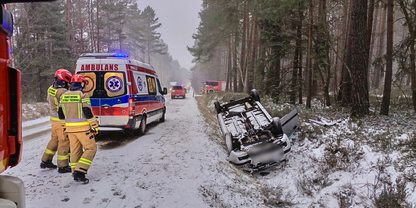 Dachowanie osobówki na DW 218! Uwaga na utrudnienia w ruchu