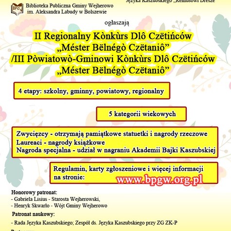 Finał regionalny konkursu i wręczenie nagród laureatom odbędzie się 26 listopada 2016 r. w godz. od 9:00 do 15:00 w Bibliotece Publicznej Gminy Wejherowo - Filia nr 1, ul. Reja 9, 84-239 Bolszewo.