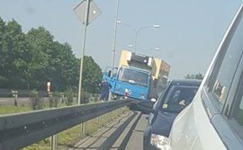 Ciężarówka wypadła z drogi i zawisła na barierkach. Do zdarzenia doszło w poniedziałek (23.05) około godziny 16:00 na krajowej szóstce w Wejherowie.